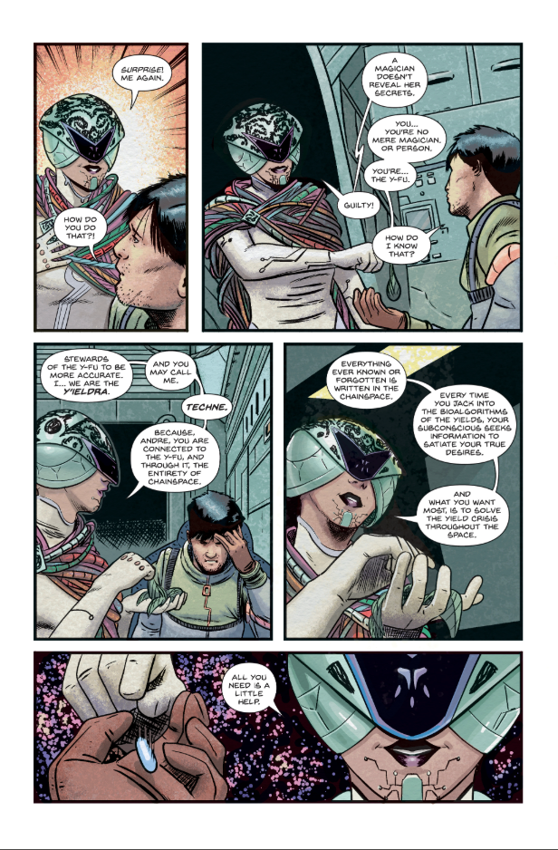 A 4-issue sci-fi epic in the vein of Heavy Metal, Dune, and Star Wars, yFu follows the story of Andre the Patcher (a planetary cyber-empath), and a young farmer named Eston'ya on the desolate world of Markap as they encounter the "yFu" goddesses - caretakers of the Yearning Tree, who may hold the key to restoring abundance to the universe, and wrench it from the clutches of the ancient, evil Cron.